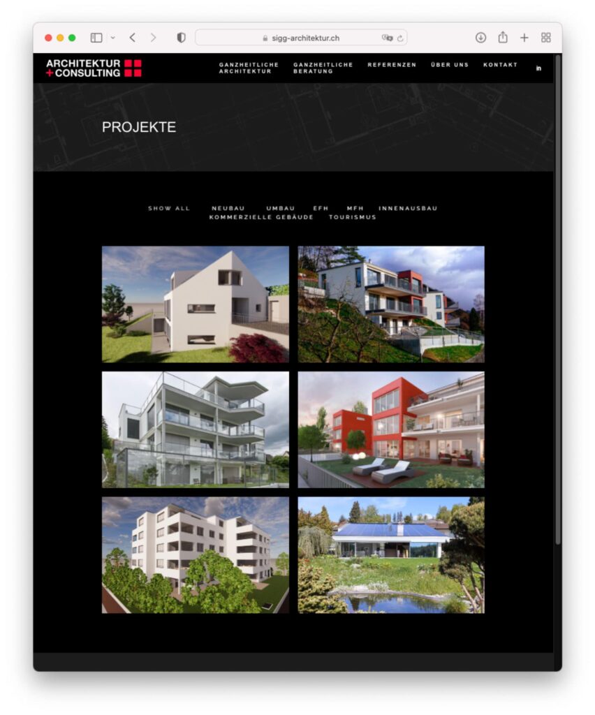 Sigg Architektur steht für eine klare architektonische Haltung und eine Vielzahl hochwertiger Projekte. Diese Vielfalt sichtbar zu machen und gleichzeitig Orientierung zu bieten, ist eine zentrale Herausforderung in der digitalen Kommunikation eines Architekturbüros.